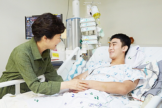 박근혜 대통령이 6일 오후 분당서울대병원을 방문해 지난달 4일 DMZ 지뢰도발로 인해 부상을 당한 육군 하재헌 하사를 격려하고 있다.