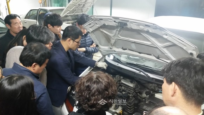 | ▲ 지난해 실시된 1~2기 ‘자동차 오너 정비교실 강좌’에 참석한 교육생들이 자동차 엔진부품 설명을 듣고 있다. | ||