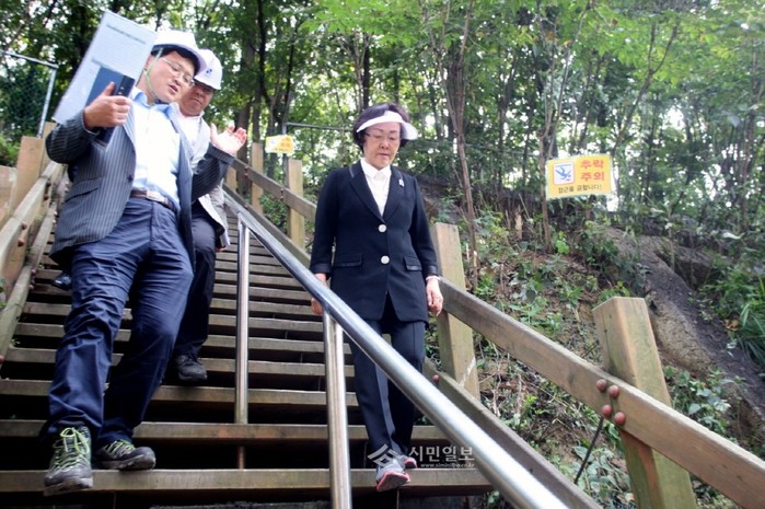 최근 신연희 서울 강남구청장(오른쪽)이 재해취약지역 점검을 위해 수서동 인근 절개지를 방문해 직접 무너지거나 고장난 곳을 살피며 예방 점검을 하고 있다.(사진제공=강남구청)