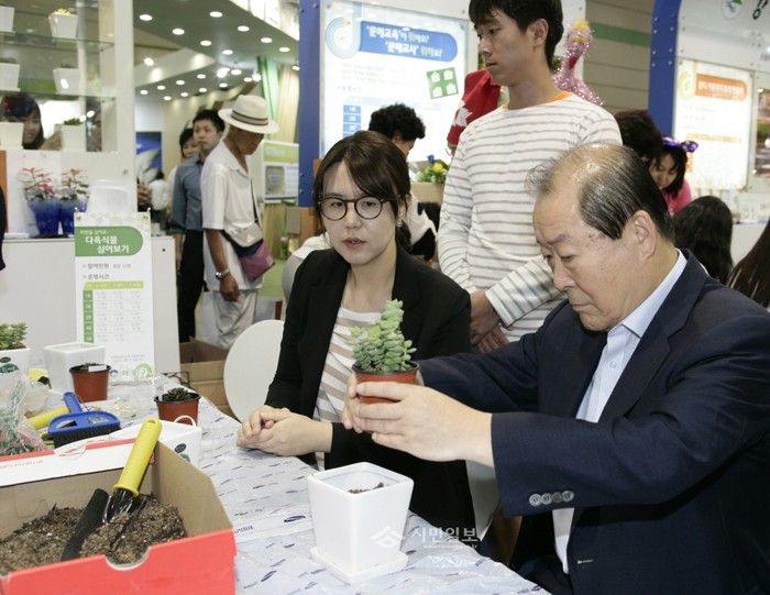 최근 박홍섭 마포구청장(오른쪽)이 서울 강남구 코엑스 C홀에서 개최된 '제4회 대한민국 평생학습 박람회'의 마포구 홍보체험관에서 '자연을 심어요, 다육식물 심기' 체험활동에 참여하고 있다.(사진제공=마포구청)