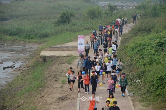 경기 포천시 포천동이 지난 5일 포천체육공원에서 '생태관찰로 체험 동민걷기대회'를 개최했다. 사진은 이날 걷기대회에 참여한 주민들이 천변을 걷고 있는 모습.(사진제공=포천시청)