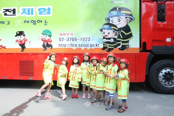 서울 동작소방서는 최근 동작구 보라매공원에서 노벨어린이집 등 어린이 70여명을 대상으로 '이동안전체험차량 소방안전교육'을 실시했다. 사진은 안전교육에 참여한 어린이들의 모습.(사진제공=동작소방서)
