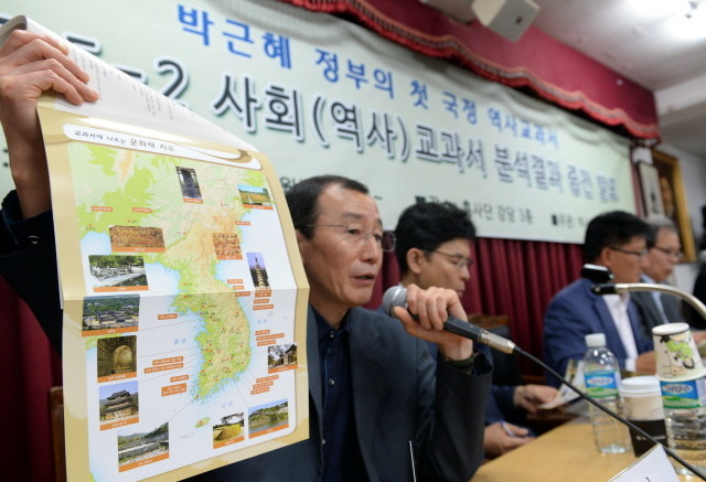 7일 오전 서울 동대문구 혜화동 흥사단강당에서 진행된 ‘역사교육연대회의, 박근혜 정부의 첫 국정역사교과서 분석결과 중간발표’에서 하일식 연세대 사학과 교수가 역사교과서에 첨부된 지도를 펼쳐보이며 잘못된 부분을 설명하고 있다.