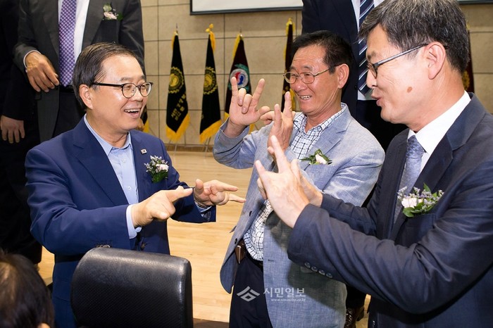 경북 구미시는 최근 구미시장애인체육관에서 경북지역 농아인 및 가족, 농아인 지도자, 수화통역사 등 600여명이 참석한 가운데 한국농아인협회경상북도협회 주관으로 '제9회 경북 농아인의 날 기념식'을 개최했다. 사진은 행사에 참여한 남유진 구미시장(왼쪽)이 참여자들로부터 수화를 배우고 있는 모습.(사진제공=구미시청)