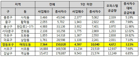 둘째, 수요와 공급 분석이다. 대표적인 업무중심 지역인 강남·서초·종로·마포·여의도 등의 경우 지역 내 사업체수 및 종사자들이 밀집하여 직주 근접형 오피스텔을 선호하는 직장인들 수요가 거의 대부분을 차지한다.