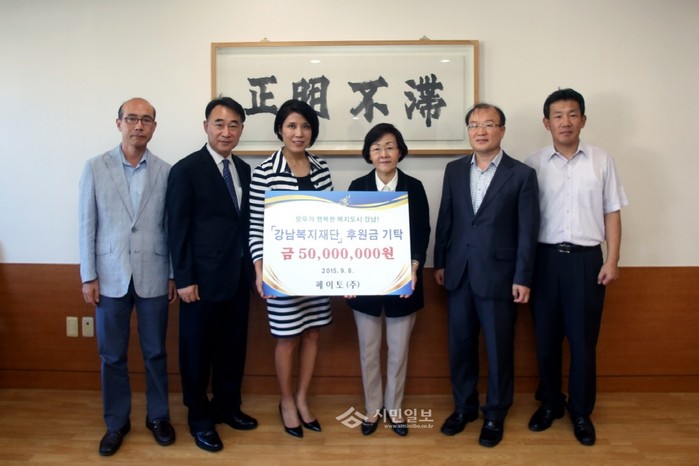 지난 8일 강남구청에서 신연희 구청장(오른쪽에서 세 번째)이 이재훈 페이토(주) 대표이사(오른쪽에서 네 번째)로부터 '강남복지재단 후원금'을 전달받고 관계자들과 기념촬영하고 있다.(사진제공=강남구청)