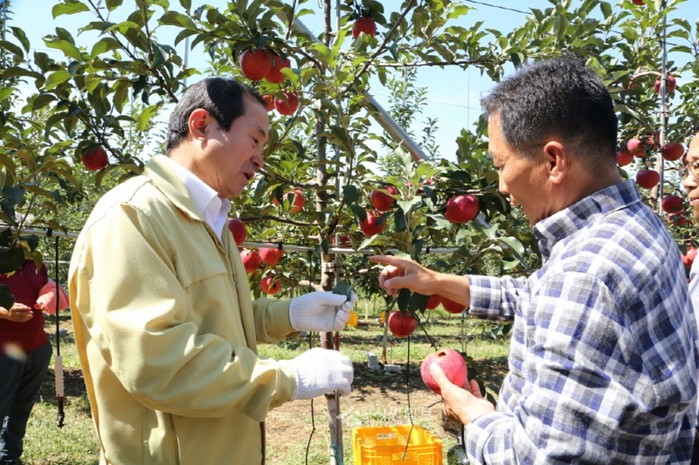 경기 연천군은 지난 7일 추석을 앞두고 조생종인 홍로 사과 품종을 수확해 시장에 공급했다. 사진은 사과 재배 현장을 찾은 김규선 연천군수(왼쪽)의 모습.(사진제공=연천군청)