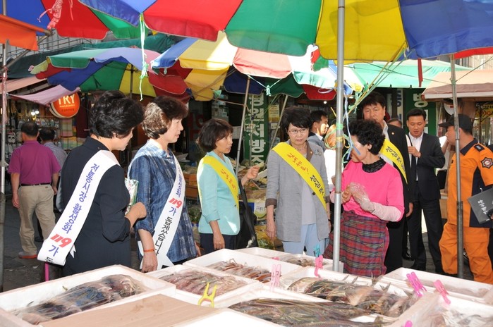 지난 8일 서울 강남구 영동 전통시장에서 강남소방서와 강남소방서 의용소방대와 함께하는 '119 사랑나눔 전통시장 장보기' 행사에 참석한 강남구의원들이 시장에서 물건을 고르고 있다.(사진제공=강남구청)