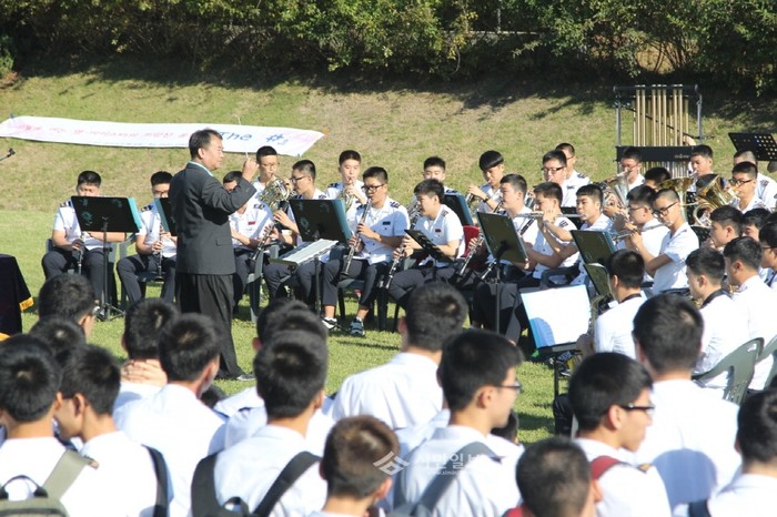 경북 구미시 금오공업고등학교는 지난 8일 오전 야외 소운동장에서 학생들의 바른 인성 함양을 위한 'THE # 교정 음악회' 행사를 개최했다. 사진은 이날 음악회에서 학생들이 다양한 악기를 지휘에 맞춰 연주하는 모습.(사진제공=구미교육지원청)