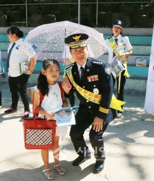 지난 9일 경기 부천소사경찰서가 범박초등학교 일대에서 학교폭력 예방 및 근절을 위한 캠페인을 실시한 가운데 구장회 경찰서장이 한 아이에게 팸플릿을 전달한 후 기념촬영을 하고 있다. (사진제공=부천소사경찰서)
