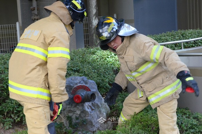 영등포소방서는 지난 9일 오후 문래동 현대힐스테이트아파트에서 '고층건축물 현지적응훈련'을 실시했다. 사진은 이날 훈련에 참여한 소방대원들이 송수관을 호스에 연결하고자 뚜껑을 열고 있는 모습.(사진제공=영등포소방서)