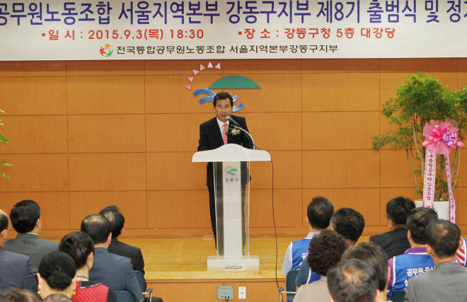 이날 성임제 의장은 “공무원노조강동구지부의 제8기 출범식을 축하드리고, 행사준비에 수고해주신 백남식 지부장님을 비롯한 조합원 여러분께 감사드린다”며, “앞으로 우리 강동구지부가 1,200여 강동가족과 50만 강동구민을 위해 공직사회를 개혁하고 부정부패를 추방하여 국민에게 신뢰받는 공직사회를 만드는데 앞장서주시기 바라며, 강동구의회에서도 강동구의 발전을 위해 서로 협력하고 상생할 수 있도록 노력하겠다”고 축사했다.