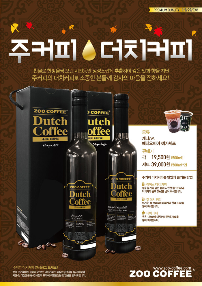주커피 더치커피 선물세트는 커피전문점 주커피 직영점(논현점, 상암DMC점) 외 일부 가맹점에서 구입할 수 있다. 상품문의는 웹사이트(www.zoo-coffee.com)나 전화(02-3472-8500)로 가능하다.
