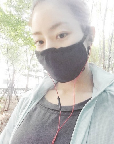 강소라는 사진 속에서 가벼운 운동복 차림에 얼굴을 가리는 검정 마스크를 착용한 채 이어폰을 귀에 꽂고 산책을 하는 듯 한 모습이다. 또렷한 눈매와 이마가 얼굴을 가렸음에도 강소라 임을 분명히 보여주고 있다.