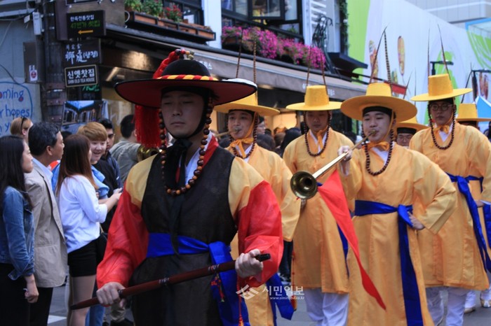 지난 12일 서울 종로구 인사동에서 열린 '제28회 인사전통문화축제 거리 퍼레이드' 참가자들이 전통의상을 입고 대취타를 불며 인사동 거리를 걷고있다. (사진=이대우 기자)