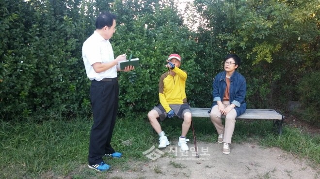 박미라 경기 안산시 상록구청장(오른쪽에서 첫 번째)은 최근 생활민원 처리상황 점검 및 민원 해결을 위해 건건동 운동기구 정비 민원현장을 방문해 현장의 주민으로부터 불편사항을 청취하고 있다.(사진제공=안산시청)