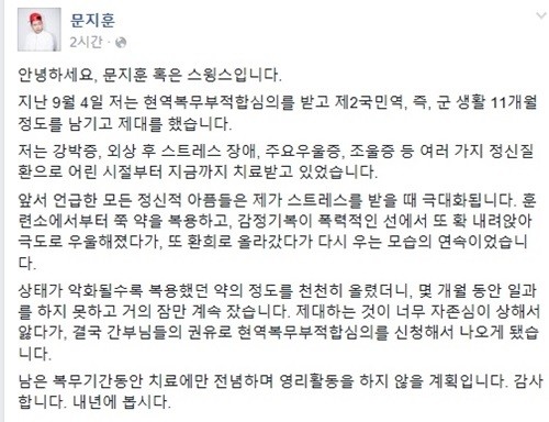 | ▲ 의병전역한 스윙스 문지훈의 페이스북 화면 캡쳐 | ||