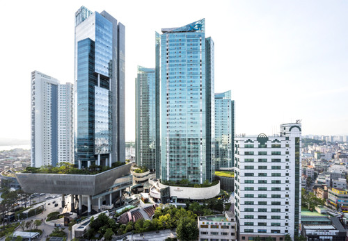 합정 메세나폴리스는 중앙광장과 분수광장, 어린이공원, 야외무대 등 공간활용을 극대화한 수직형친환경 설계공법으로 대지면적의 약 26%를 녹지로 조성해, 도심 속 자연공간을 구현했다.