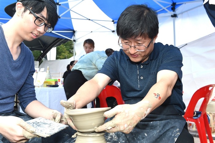 김성환 노원구청장이 최근 중계동 중계등나무근린공원서 열린 ‘제3회 평생학습 마을축제 한마당’에서 마을학교 프로그램 부스를 방문해 도자기공예 체험을 하고 있다.(사진제공=노원구청)