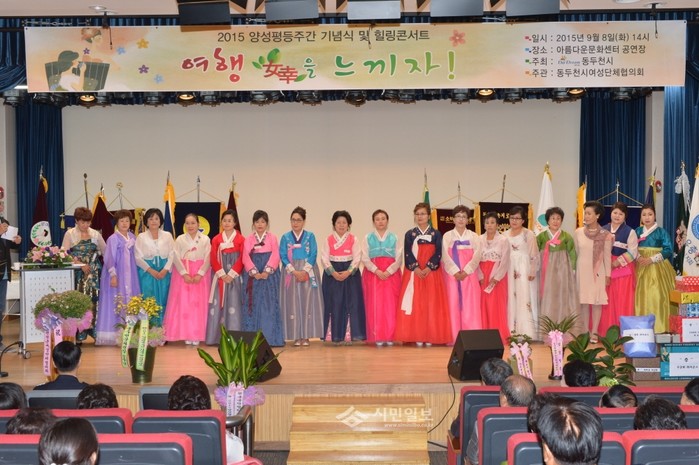 최근 경기 동두천시 아름다운문화센터에서 실질적 양성평등 사회의 실현을 위해 개최된 ‘제20회 양성평등주간 기념행사’에 참가한 참가자들이 고운 한복을 입고 무대 위에 서 있다.(사진제공=동두천시청)