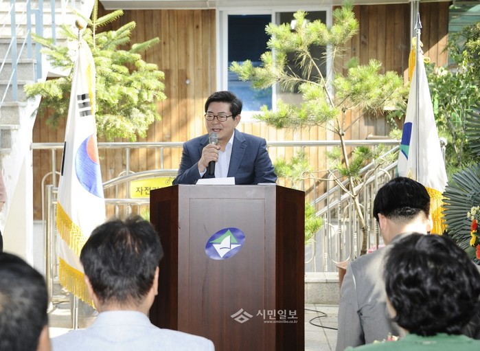 광진구는 최근 자양1동주민센터 앞에 자양동을 상징하는 ‘자마(雌馬) 조형물’이 성공적으로 설치된 것을 기념하기 위해 제막식을 개최했다. 사진은 제막식에 참석한 김기동 구청장이 인사말을 하는 모습.(사진제공=광진구청)