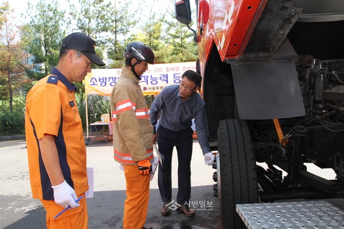 관악소방서는 지난 14일 본서 후정에서 국민안전처로부터 '소방장비조작능력 종합점검 상태'를 평가받았다. 사진은 장비를 점검하며 소방장비 발전방향에 대한 이야기를 나누고 있는 관계자들의 모습.(사진제공=관악소방서)