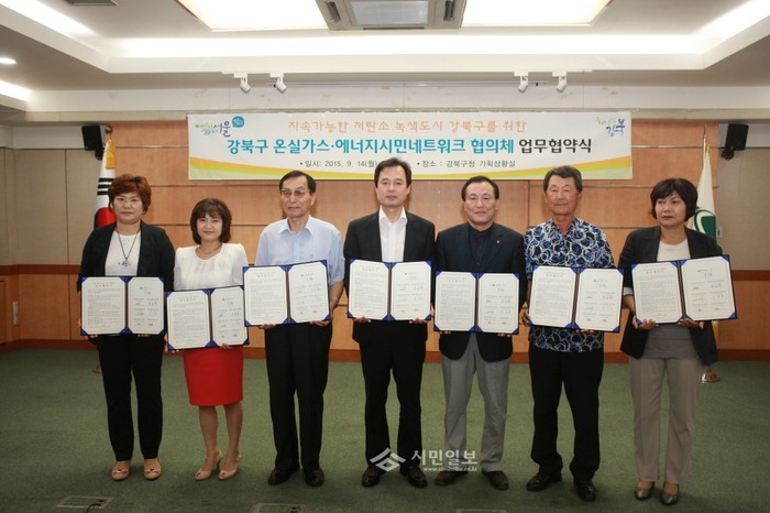 서울 강북구가 지난 14일 ‘강북구 온실가스·에너지시민네트워크 협의체’를 구성한 가운데 구청 기획상황실에서 박겸수 강북구청장(가운데)과 단체 관계자들이 '저탄소 녹색도시 강북구'를 만들기 위한 에너지 절약 업무협약식을 열고 있다.(사진제공=강북구청)