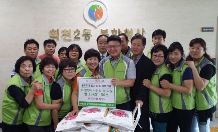 경기 양주시 회천2동 주민자치위원회는 지난 14일 회천2동 주민센터에서 추석 명절을 맞아 지역내 홀몸노인 등 저소득층을 위해 써달라며 150만원 상당의 10kg 쌀 50포를 기부했다. 사진은 전달식에 참석한 관계자들의 모습.(사진제공=양주시청)