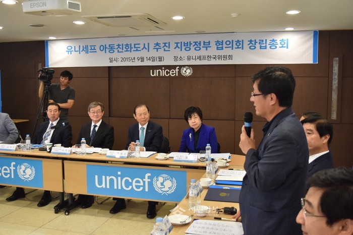 김성환 서울 노원구청장(오른쪽)이 지난 14일 오후 3시 서울 종로구 창성동 유니세프한국위원회 2층 회의실에서 열린 ‘아동친화도시 추진 지방정부 협의회’ 창립총회에 참석해 인사말을 하고 있다.(사진제공=노원구청)