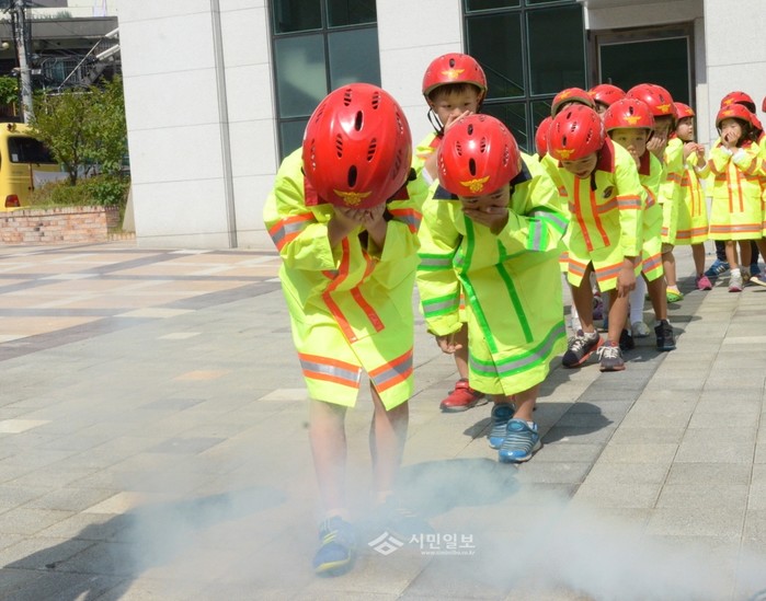 서울 영등포소방서는 지난 14일 오전 신길동에 위치한 신길어린이집에서 생활속의 안전사고를 예방하고자 어린이들을 대상으로 소방안전체험차량을 이용한 '찾아가는 어린이 소방안전체험 교실'을 운영했다. 사진은 이날 어린이들이 화재 발생시 연기 발생에 따른 대피방법 체험을 하고 있는 모습.(사진제공=영등포소방서)