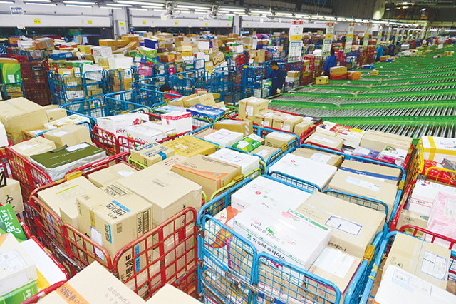 민족 최대의 명절 추석을 앞둔 15일 오전 서울 광진구 동서울우편물류센터에서 직원들이 추석 선물 택배 물량을 분류하고 있다.