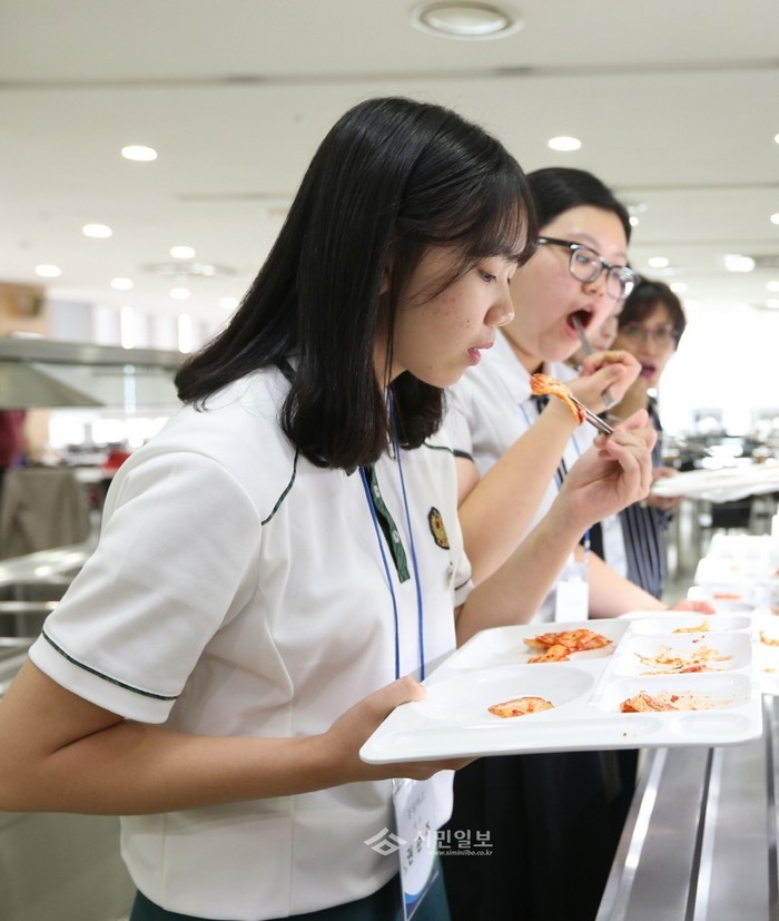 서울 금천구는 지난 14일 오후 3시 구청 대강당에서 ‘학교급식 우수 김치 공동구매 품평회’를 개최했다. 사진은 행사에 참석한 학생들이 김치의 맛을 보고 평가하는 모습.(사진제공=금천구청)