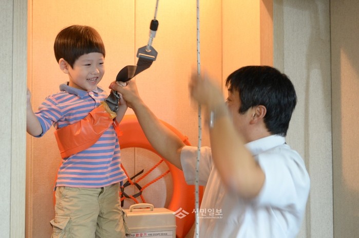 서울 영등포소방서가 지난 15일 오전 소방서 4층 소방안전체험관에서 문래현대어린이집 보육교사와 어린이 20여명을 대상으로 '소방안전체험 교육'을 실시한 가운데 한 어린이가 완강기 탈출 체험을 하고 있다.(사진제공=영등포소방서)