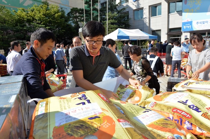 동대문구가 지난 15일 오후 3시 구청 광장에서 구·동 직원과 1대 1 결연을 맺고 있는 1350가구를 대상으로 '제4회 추석명절 희망나눔의 장' 행사를 개최, 구청직원들이 희망물품을 나르고 있다.(사진제공=동대문구청)