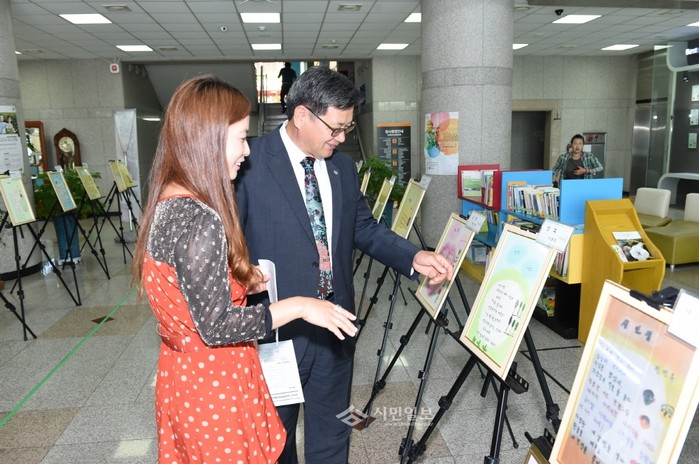 경기 양주시는 18일까지 청사 1층 로비에서 2015년 성인문해교육 지원사업 공모 선정으로 추진하고 있는 한글교실 노인들의 시화전을 개최한다. 사진은 지난 15일 시화전에 참석해 작품을 감상하고 있는 양주시장 권한대행 김건중 부시장의 모습.(사진제공=양주시청)