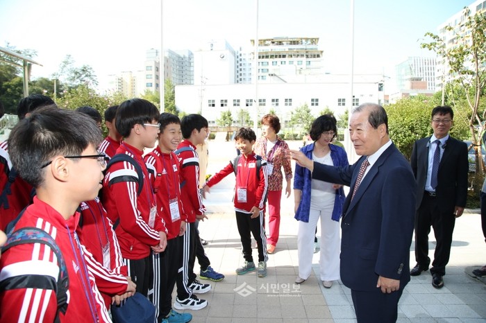 지난 15일 박홍섭 마포구청장이 마포구 성산동의 성원초등학교 축구부를 찾아가 마포구 자매도시인 중국 베이징시 석경산구를 방문해 친선 축구경기를 펼칠 선수들을 격려했다. 성원초등학교 축구부는 4박5일 일정으로 중국 석경산구를 방문한다.(사진제공=마포구청)