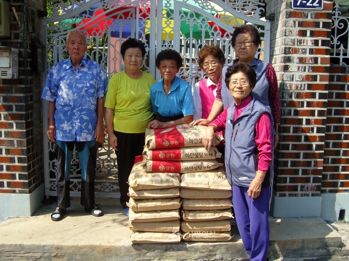 지난 14일 추석을 맞아 경기 동두천시 중앙동 1통의 생활이 어려운 15가구를 돕기 위해 남옥봉씨와 바르게살기위원회 회원·주민들이 각 가정에 15kg의 설탕을 1포씩을 전달했다. 사진은 이날 설탕을 기부한 노인들의 모습.(사진제공=동두천시청)