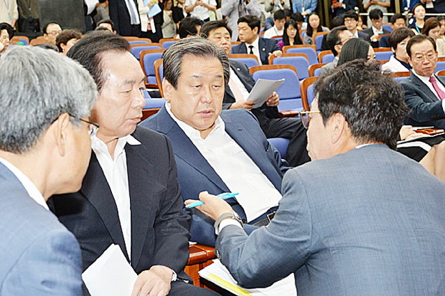 16일 오전 서울 여의도 국회 246호 회의실에서 열린 새누리당 정책의총에서 김무성 대표와 이인제 노동시장선진화특별위원회 위원장, 이완영 의원이 이야기를 나누고 있다.