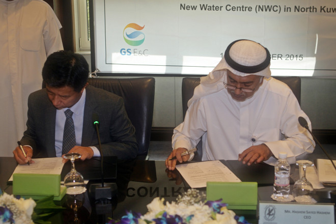 | ▲ 지난 15일 쿠웨이트시티에 위치한 쿠웨이트 석유회사(KOC, Kuwait Oil Company)에서 열린 NWC(New Water Center) 프로젝트 계약식에서 하셈 사예드 하셈(Mr. Hashem Sayed Hashem) KOC CEO(오른쪽)·임병용 GS 건설 CEO(왼쪽)가 계약서에 서명하고 있다. | ||