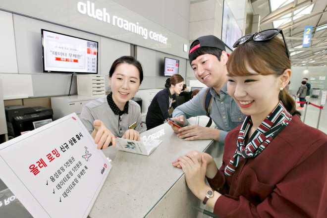 | ▲인천국제공항에 위치한 올레 로밍 센터에서 출국하는 고객들이 신규 서비스에 대해 상담 받고 있다. | ||