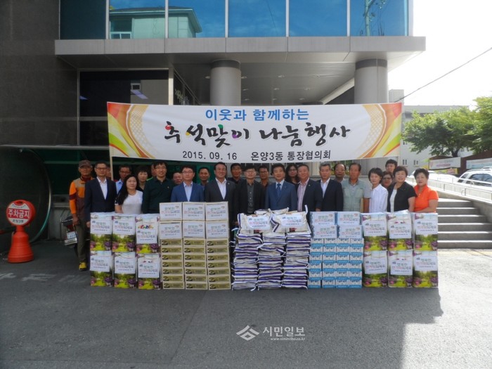충남 아산시 온양3동 통장협의회와 아산축산농협은 추석을 맞아 지난 16일 지역내 소외된 이웃에 사랑의 후원품을 전달했다. 사진은 전달식에 앞서 협의회·농협 관계자들이 기념사진을 찍는 모습.(사진제공=아산시청)
