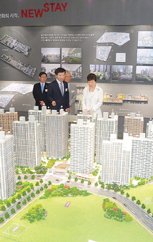 박근혜 대통령이 17일 오전 인천 남구 도화동 1호 뉴스테이(기업형 임대주택) 착공식에 참석, 견본주택을 둘러보고 있다.