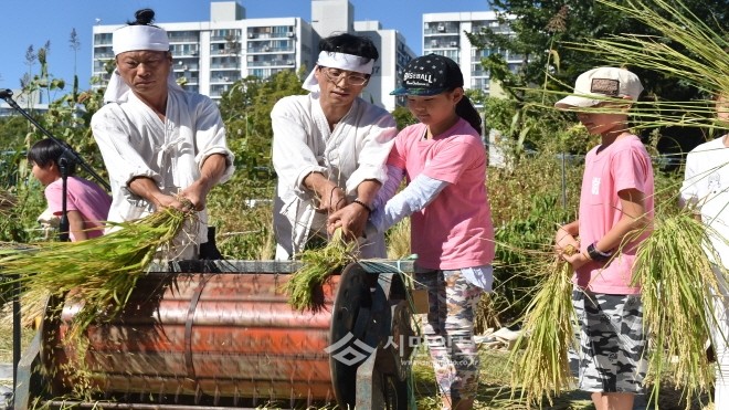 서울 노원구가 지난 17일 오후 1시20분 마들근린공원에서 '마들농요와 함께하는 벼베기, 탈곡 체험행사'를 개최해 참여 어린이들이 마들농요보존회 회원들과 함께 탈곡체험을 하고 있다.(사진제공=노원구청)