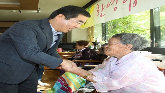 [광명=류만옥 기자]양기대 경기 광명시장은 추석을 앞두고 지난 16일 광주에 있는 일본군 위안부 피해 할머니들이 거주하는 나눔의 집을 방문, 300만원의 성금을 전달했다. 사진은 양 시장이 한 할머니와 악수를 나누며 위로하고 있는 모습.