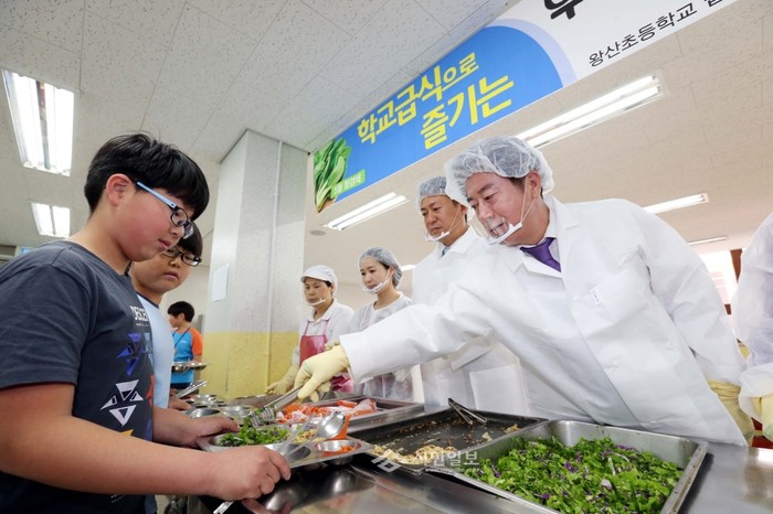 | ▲ “학생들에게 안전하고 신선한 급식을 제공하겠다”는 의지를 밝힌 정찬민 용인시장(오른쪽)이 한 학교를 찾아 로컬푸드로 만든 음식을 학생들에게 배식하고 있다. | ||