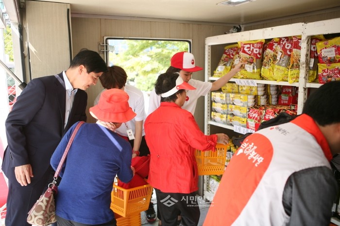 최근 서울 천일중학교에서 개최한 ‘사랑의 이동푸드마켓, 한가위 사랑나눔 대축제’ 행사에 참가한 이해식 강동구청장(왼쪽)이 물품을 고르고 있는 저소득층 주민들을 돕고 있다.(사진제공=강동구청)