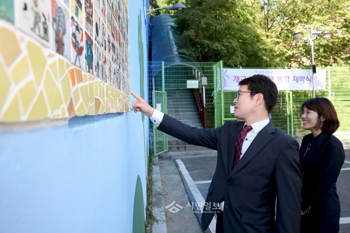지난 18일 서울 성동구 무학초등학교가 개교 100주년을 맞았다. 이를 기념해 높이 13m·너비 53m의 거대한 옹벽에 조성한 전교생 640명의 꿈을 담은 그림타일을 바라보고 있는 정원오 성동구청장.(사진제공=성동구청)