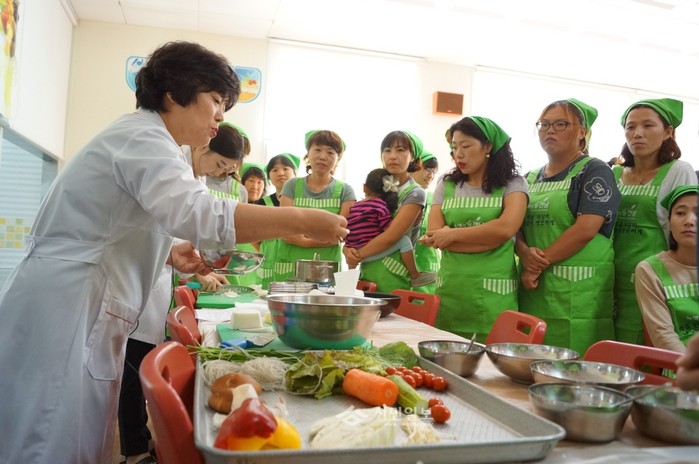 전남 여수시 상암초등학교는 최근 노희경 동신대학교 식품영양학과 교수를 초빙해 학부모와 교사를 대상으로 영양간식 만들기·바른식생활 교육을 실시했다. 사진은 이날 참여자들이 노 교수(맨 왼쪽)의 영양간식 만들기 수업을 듣고 있는 모습.(사진제공=전남교육청)