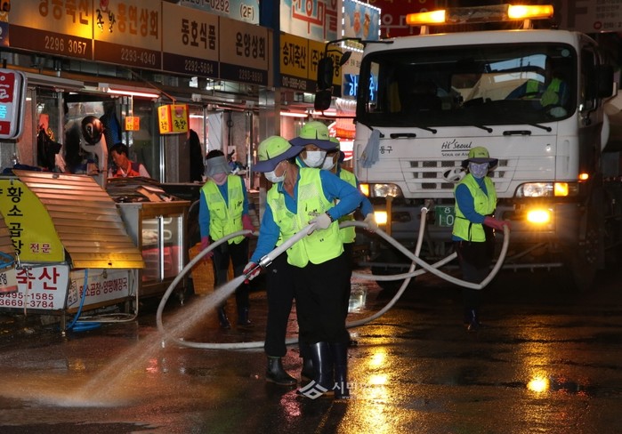22일 오전 6시30분 추석명절을 맞아 전통시장 방문객들에게 쾌적한 쇼핑환경을 제공하고자 서울 성동구 마장축산물시장에서 성동도시관리공단, 조합, 환경 미화원들이 시장 내부 바닥 물청소를 하고 있다.(사진제공=성동구청)