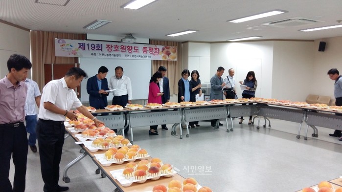 경기 이천시 농업기술센터가 최근 이천시복숭아연구소에서 '제19회 장호원황도 품평·전시회'를 개최한 가운데 심사위원들이 외관심사를 진행하고 있다. 이번 품평회에는 장호원황도 복숭아 40점이 출품됐다. (사진제공=이천시청)